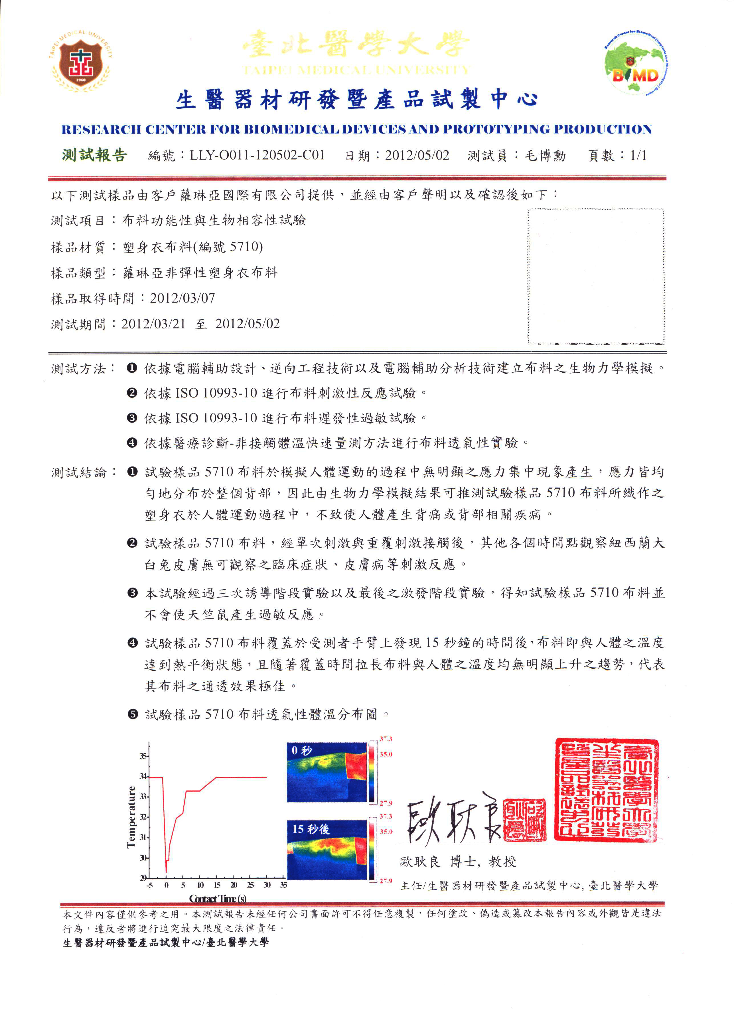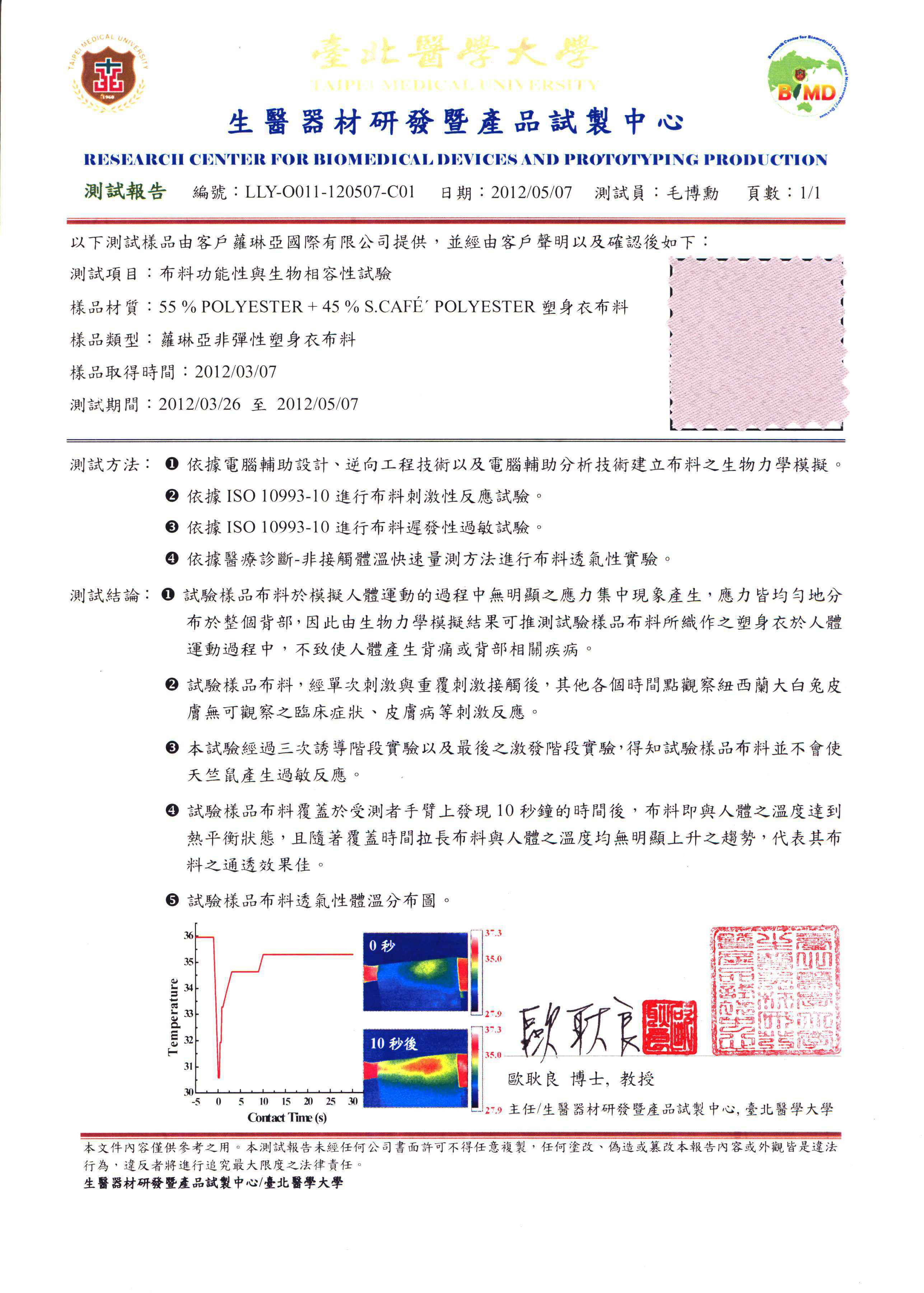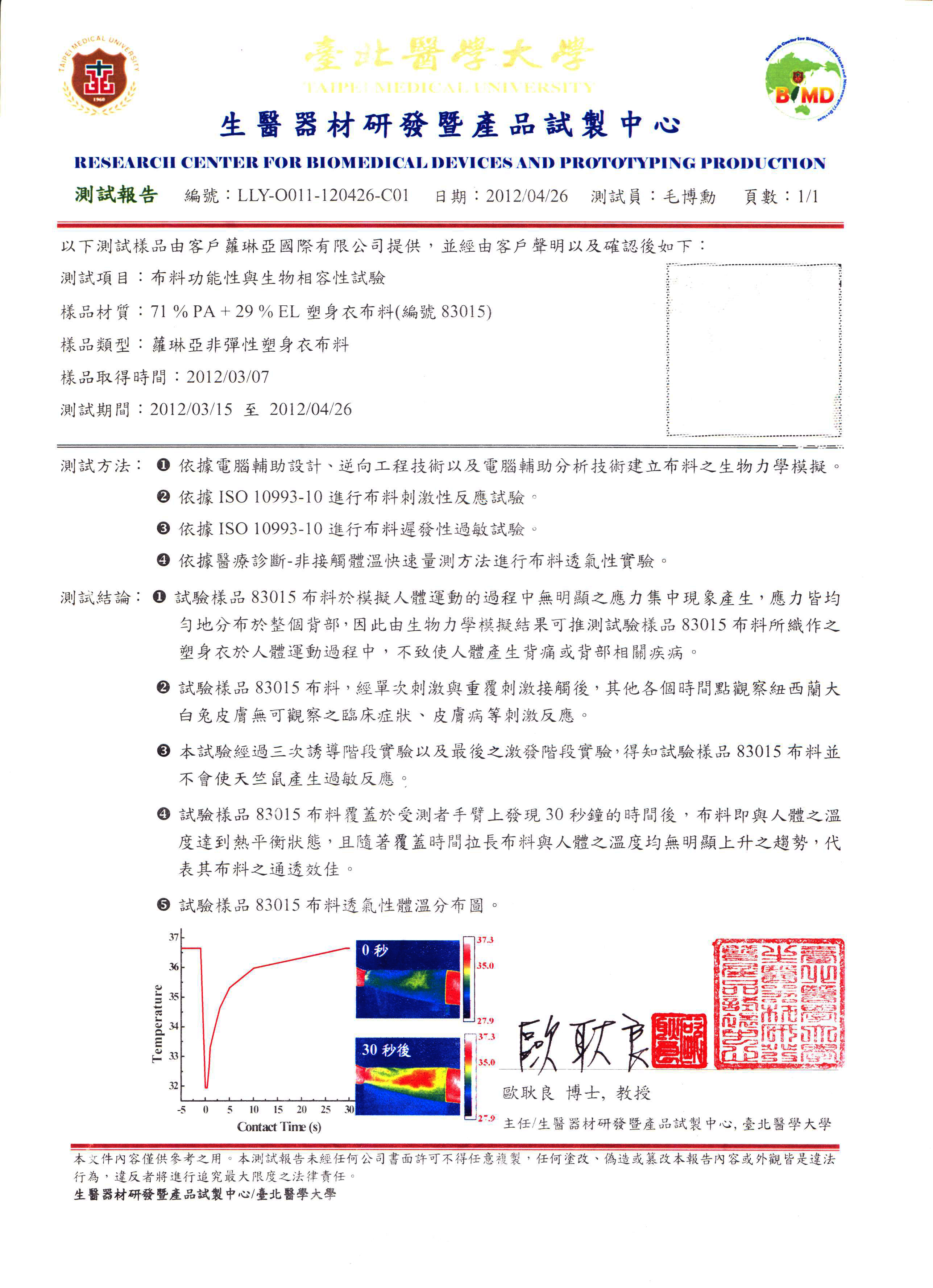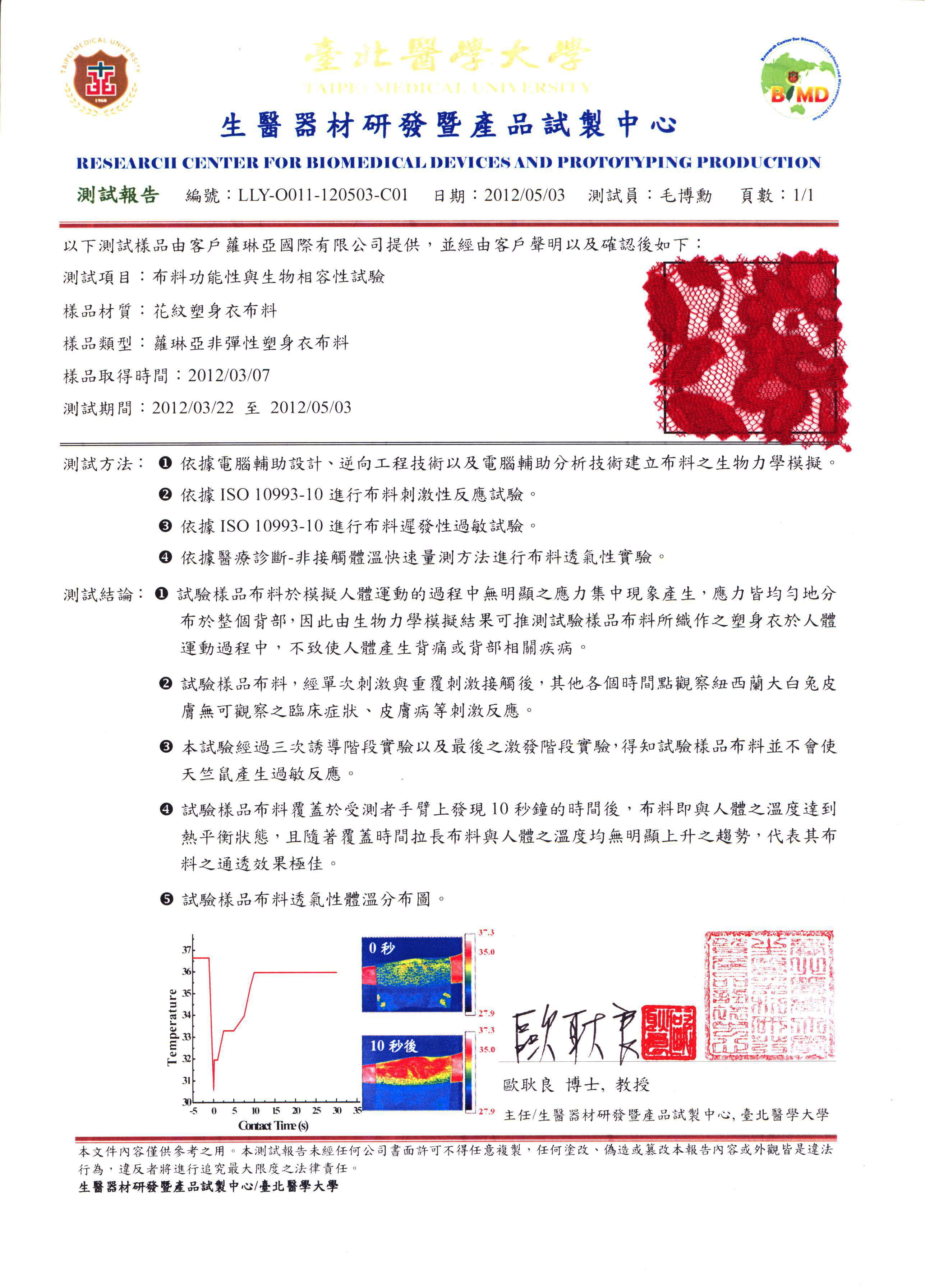經過數年的研發選材與布料測試,以「雕塑效果」、「避免皮膚敏感紅腫」、「適合長期穿著」為主軸,捨棄一般彈性布料,開創出頂級的「無感纖型布料」,經台北醫學大學-生醫器材暨產品測試中心檢測結果顯示,不會造成肌膚敏感紅腫的現象,適合作為「貼身衣著」使用的材質。