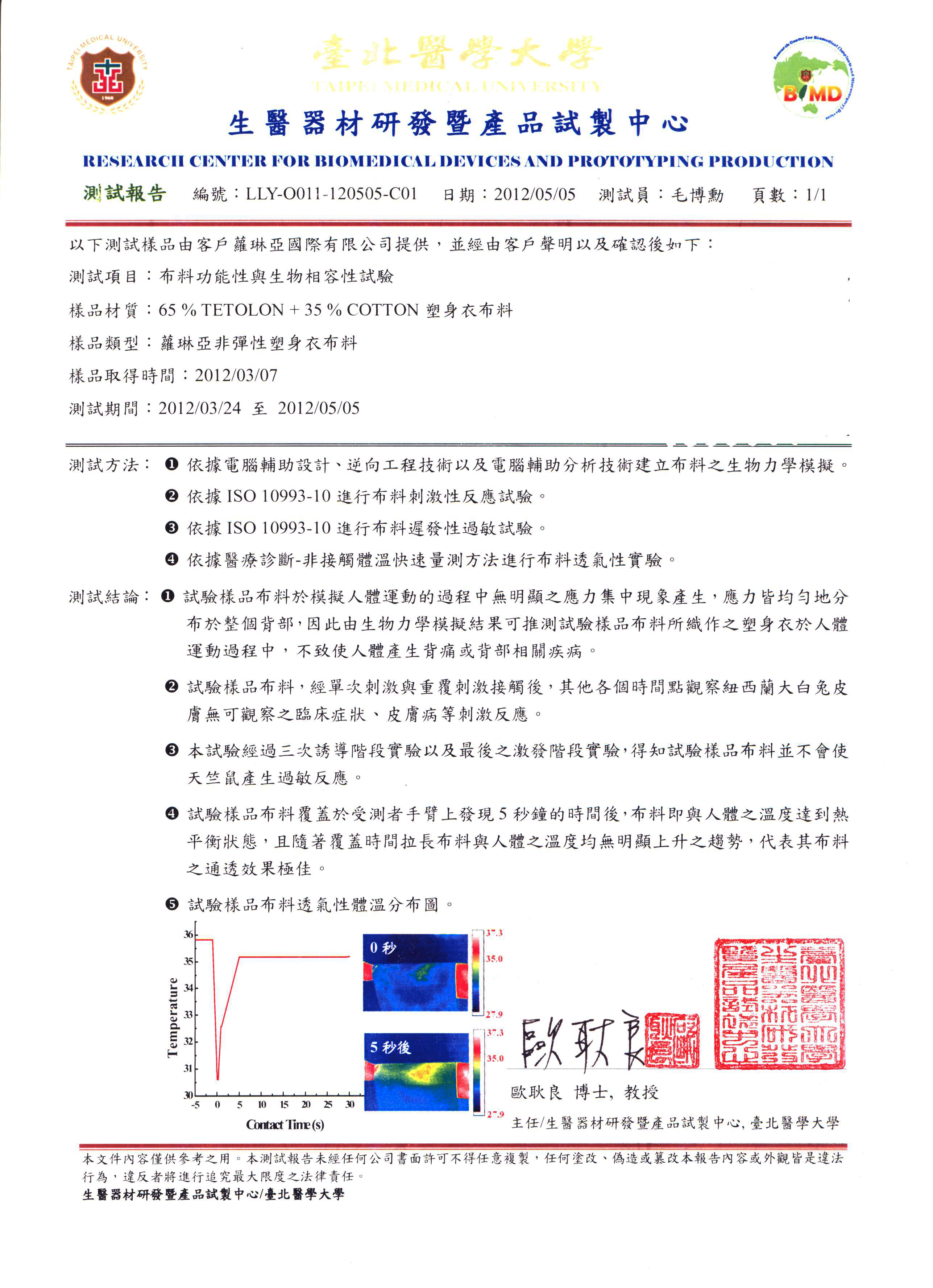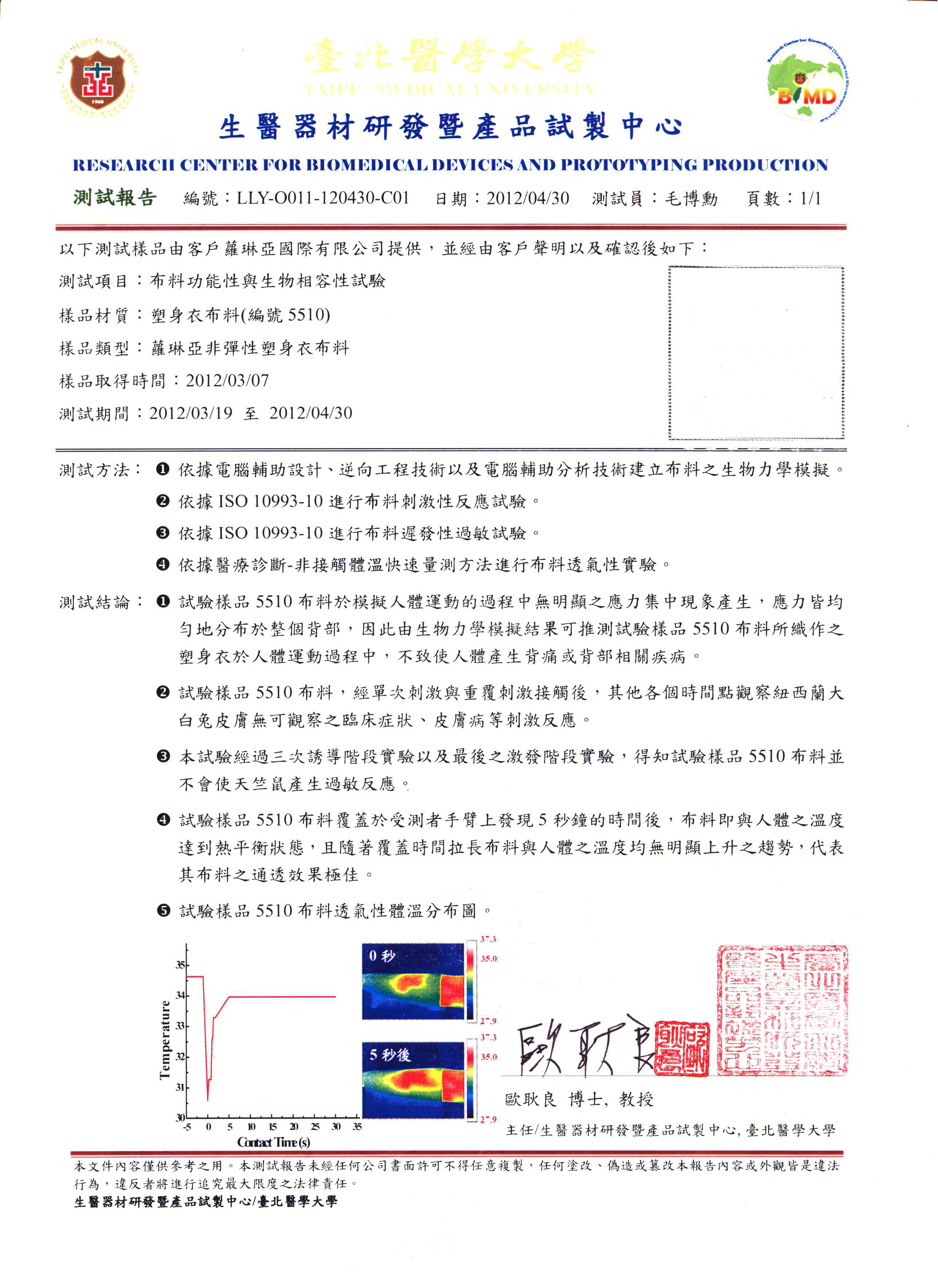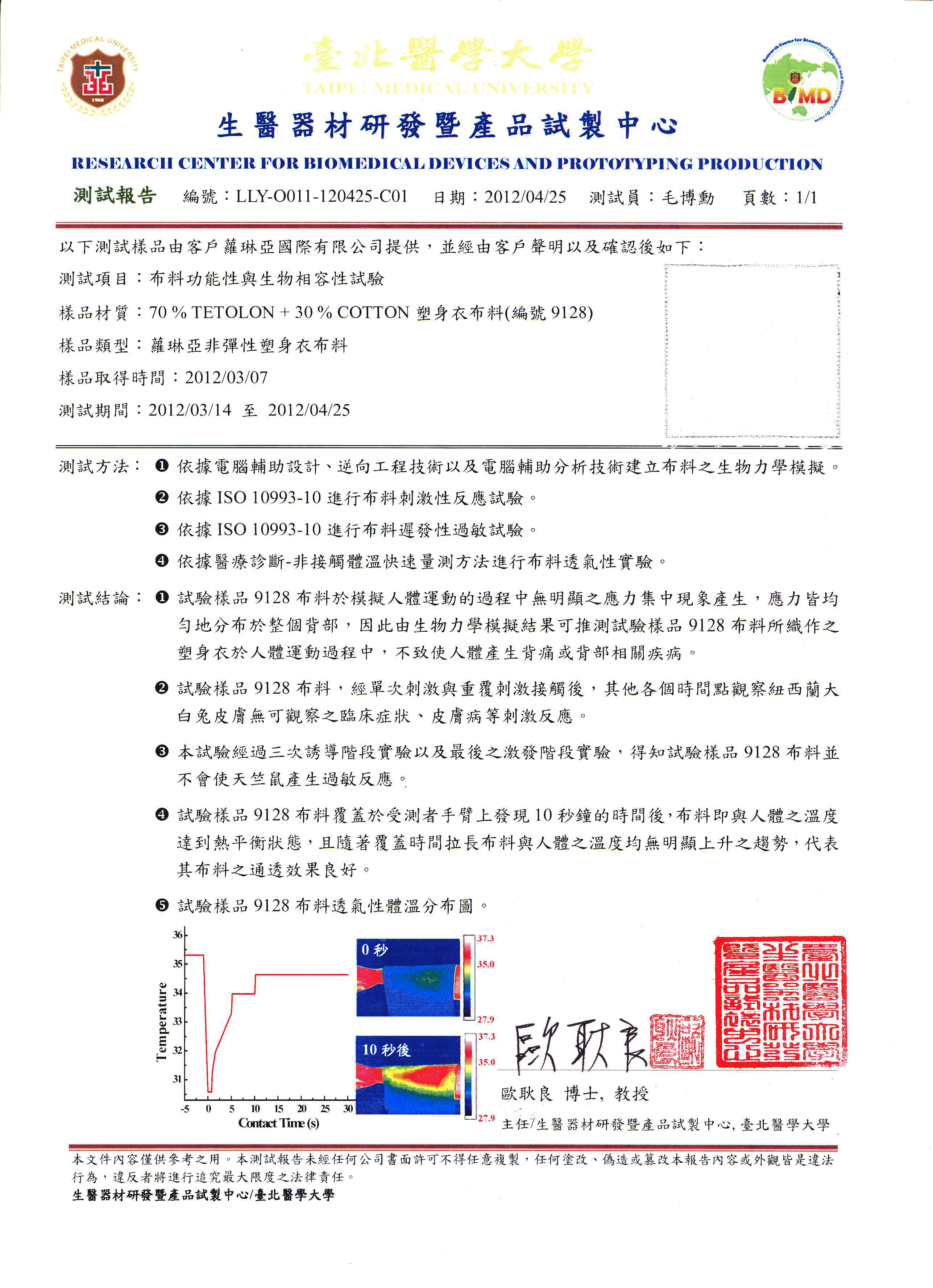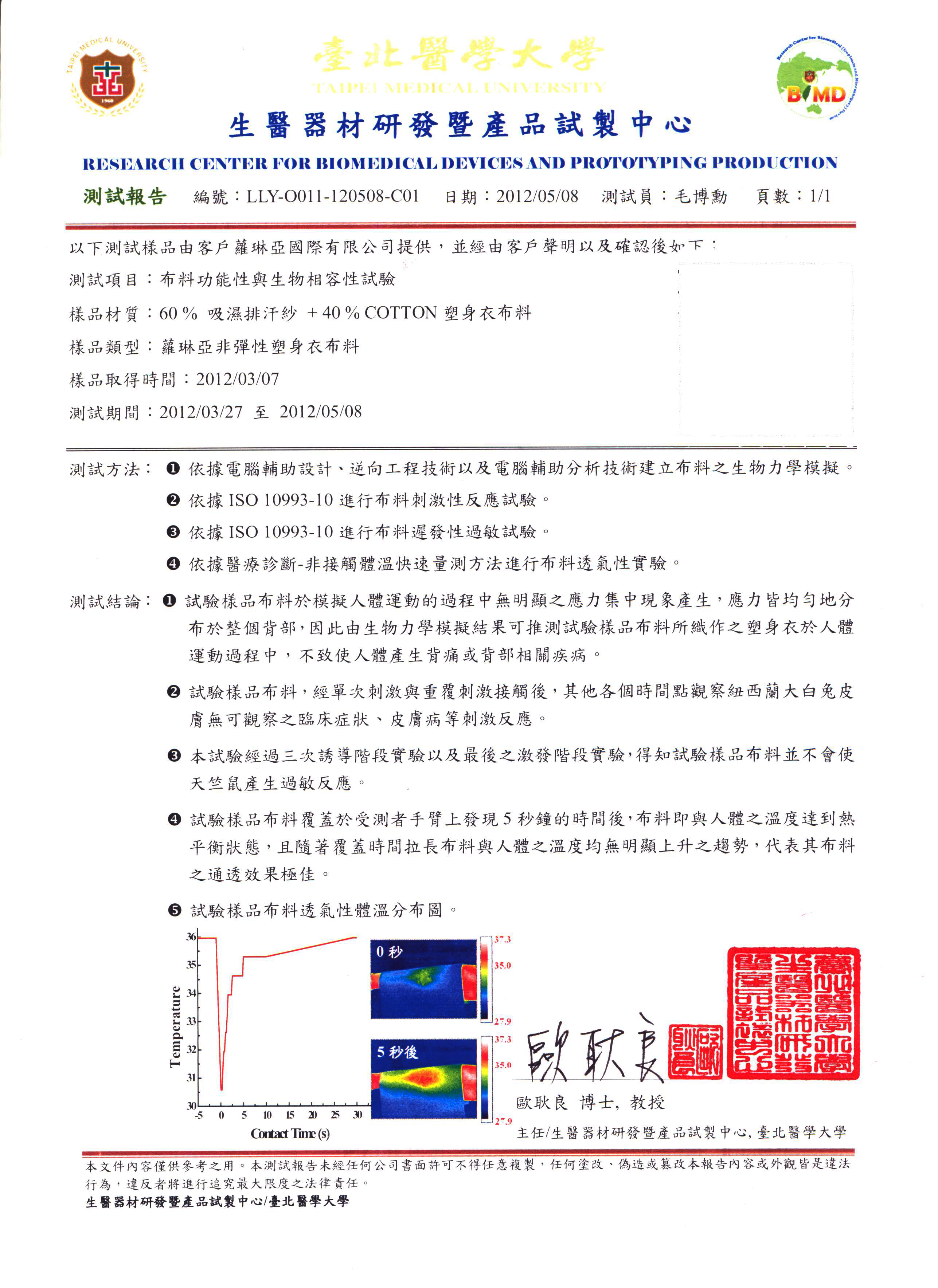 經過數年的研發選材與布料測試,以「雕塑效果」、「避免皮膚敏感紅腫」、「適合長期穿著」為主軸,捨棄一般彈性布料,開創出頂級的「無感纖型布料」,經台北醫學大學-生醫器材暨產品測試中心檢測結果顯示,不會造成肌膚敏感紅腫的現象,適合作為「貼身衣著」使用的材質。