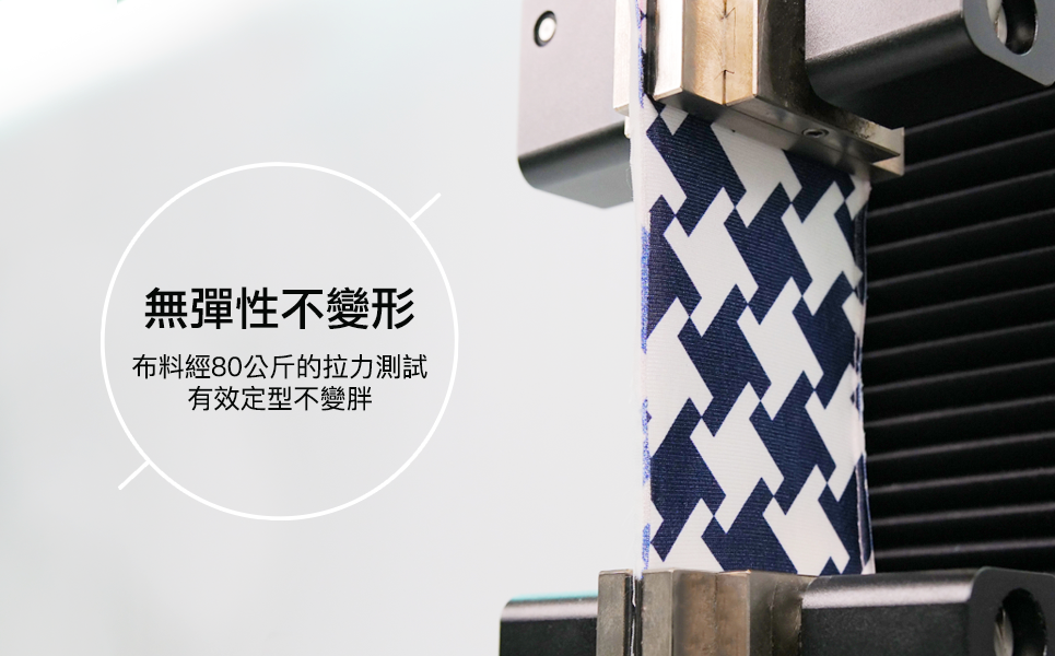 以 「雕塑效果」「適合長時間穿著」為主要考量,捨棄一般的彈性纖維材質,研發出業界唯一的「無彈性布料」,並經過80公斤的拉力測試,確保不會因身體動作或是變胖影響雕塑效果,能緊實每一吋收服贅肉,也不會因為長時間穿著導致彈性鬆弛、變形。