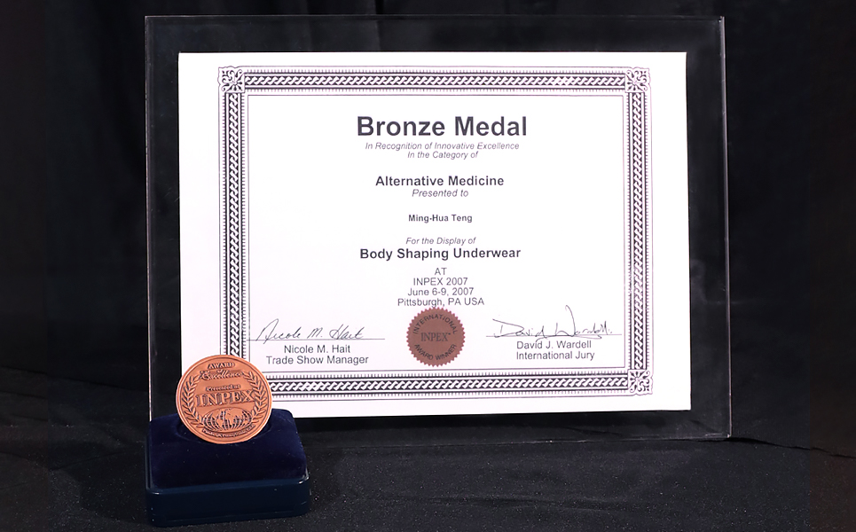S拉繩榮獲美國匹茲堡發明展『替代性醫藥』銅牌獎,穿著後可以抑制食量,並有壓縮脂肪球的功能,可以替代減肥藥,進而達成健康瘦身的功效。